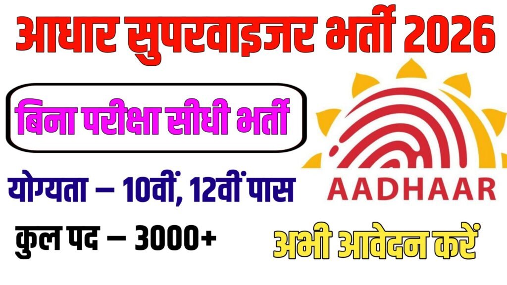 Aadhar Supervisor Recruitment 2026 : इस वक्त की बड़ी खबर सामने निकलकर आ रही। आधार सुपरवाइजर भर्ती का 3000+ पदों पर भर्ती का नोटिफिकेशन विभाग द्वारा जारी कर दिया गया है। इस भर्ती में आवेदन करने की तिथि 11 फरवरी 2026 से शुरू हो गई है तथा आवेदन करने की अंतिम तिथि 10 मार्च 2026 रखी गई। इस भर्ती परीक्षा में भारत के पुरुष और महिला दोनों अभ्यर्थी आवेदन कर सकते हैं। अभ्यर्थियों से अनुरोध है कि वे अंतिम तिथि का इंतजार ना करें और समय रहते आवेदन कर दें।