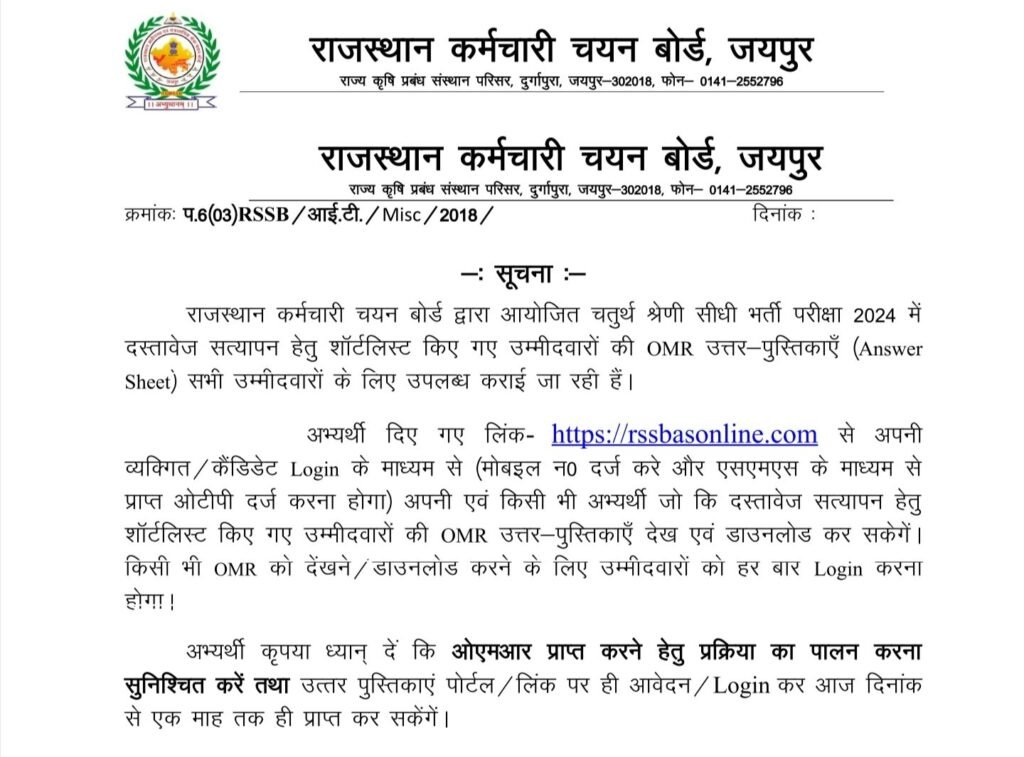 Rajasthan 4Th Grade OMR Sheet Upload Download 2025-26: RSSB 4th рдЧреНрд░реЗрдб рдЪрддреБрд░реНрде рд╢реНрд░реЗрдгреА рдХрд░реНрдордЪрд╛рд░реА рднрд░реНрддреА рдХреЗ 1 рд▓рд╛рдЦ 41 рд╣рдЬрд╝рд╛рд░ рдХреИрдВрдбрд┐рдбреЗрдЯреНрд╕ рдХреА OMR рд╢реАрдЯреНрд╕ Website рдкрд░ upload рдХрд░ рджреА рдЧрдИ рд╣реИ ред