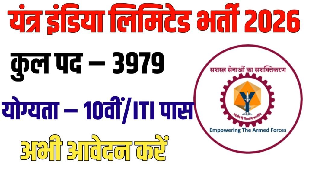 Yantra India Limited Recruitment 2026 : इस वक्त की बड़ी खबर सामने निकलकर आ रही है यंत्र इंडिया लिमिटेड ने दिया युवाओं को शानदार तोहफा। यंत्र इंडिया लिमिटेड ने 3979 पदों पर अप्रेंटिस भर्ती 2026 का नोटिफिकेशन जारी कर दिया है। योग्य और इच्छुक अभ्यर्थी यंत्र इंडिया लिमिटेड की आधिकारिक बेवसाइट से आवेदन कर सकते हैं। इस भर्ती के लिए आवेदन फॉर्म 1 फरवरी 2026 से शुरू हो गए हैं तथा आवेदन की अंतिम तिथि 3 मार्च 2026 रखी गई है। अभ्यर्थियों से अनुरोध है कि वे बिना अंतिम तिथि का इंतजार किए अपना फॉर्म समय पर भर दें।